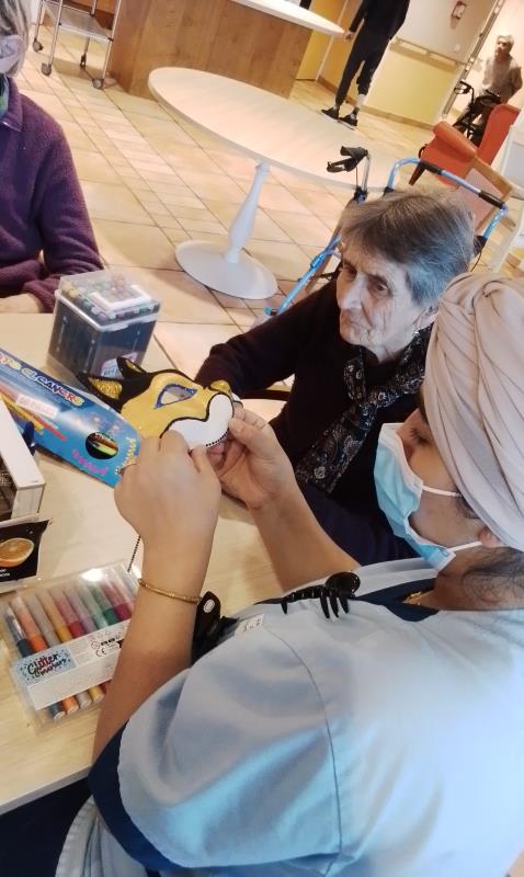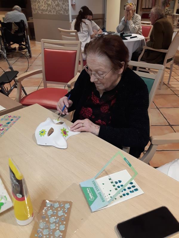 A l’occasion de Mardi gras, un concours est organisé pour élire le plus beau masque vénitien. Un membre du personnel est associé à un, deux ou trois Résidents. Pour cette création, il a fallu choisir les couleurs, et les textures à disposer sur le masque pour lui donner un côté festif. Un jury se réunira pour désigner le plus beau. Le choix s'annonce difficile en raison de la qualité des œuvres.