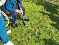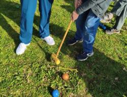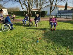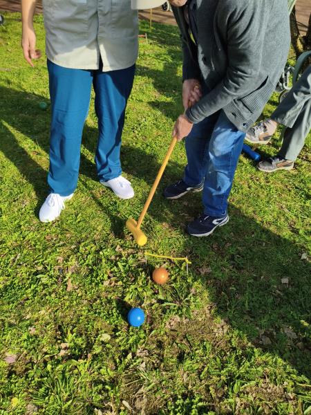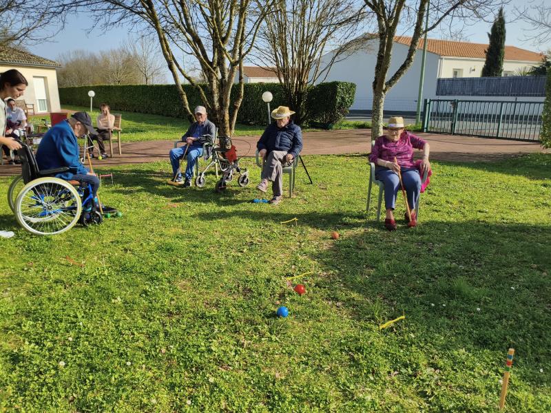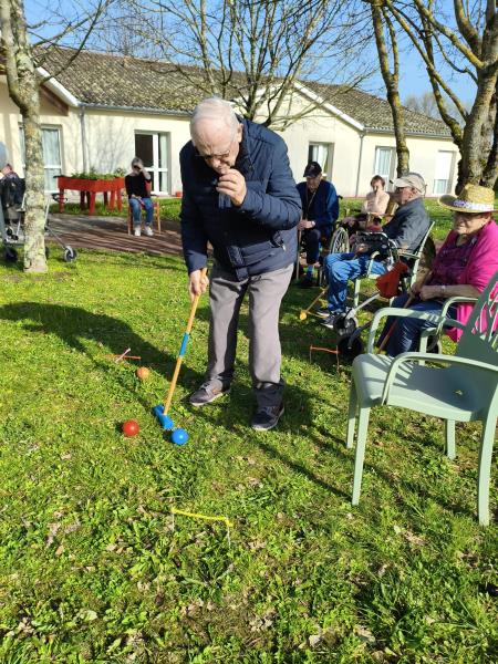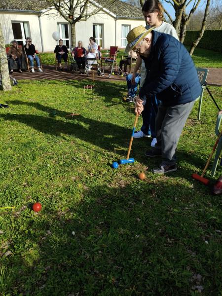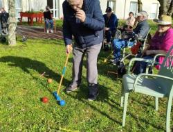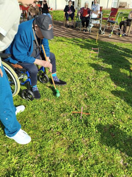 Profitant d'une météo printanière, Nina, notre enseignante d'activité physique adaptée, a délocalisé son challenge sportif dans les jardins de la résidence. Son mot d'ordre est la nouveauté, la surprise. Cette fois-ci, les Résidents ont découvert, pour certains, le croquet. Pour les non-initiés, il s'agit d'un sport d'extérieur qui consiste à faire passer des boules en bois à travers des arceaux en les frappant à l'aide d'un maillet. Les participants qui ont multiplié les coups gagnants se sont fait plaisir sous un beau soleil revigorant.