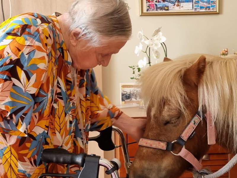 C'est avec plaisir que les résidents de l'établissement ont retrouvé Patouche, Balou et Mr Caramel (surnom donné par une résidente). Pendant que Caramel se promène de chambre en chambre pour aller voir les amis qu'il s'est fait depuis quelques semaines, Patouche et Balou sont au pied d’œuvre dans le jardin. Guidés par les résidents sur un parcours de slalom, ils ont pu aussi recevoir beaucoup de tendresse, caresses après caresses. Le rendez-vous est de nouveau pris pour dans 15 jours dans le jardin de la Résidence. La prochaine séance sera organisée au centre équestre avec les résidents qui le souhaitent.